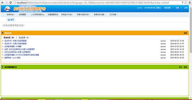 协同工作环境为企业用户提供了统一的工作环境和业务门户,用户采用一站式登陆,展现用户的个性化工作界面。把个人可以执行的业务功能、操作事项、待办事宜、关注的信息、重要提醒等按照统一的方式推送到用户面前。形成统一的、高集成的企业协同办公平台,企业的各项业务处理和协同工作均可在这个协同办公环境中开展。