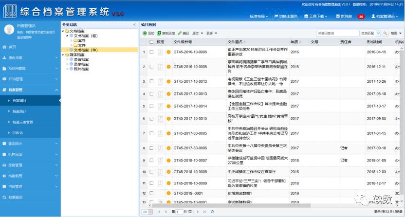 该系统响应党中央号召,基于安全可靠环境下对档案管理系统进行全面升级,结合档案管理实际业务需求,建成档案信息资源库。以实体档案的收、管、存、用过程为参考进行开发设计,支持档案管理全过程的信息化处理,通过强大的自定义表单、实体、视图及全文检索、业务流等,实现电子档案接收采集、归档编目、检索利用、鉴定统计、档案编研等档案业务管理功能;实现对已有文件资料信息资源的科学整合、集中管理、长久保存、有效利用、安全共享。同时建立标准接口,与OA系统、身份认证系统集成,并完成原系统的数据迁移,从而进一步提升档案信息化建设的总体水平,更好地维护国家档案信息资源安全。